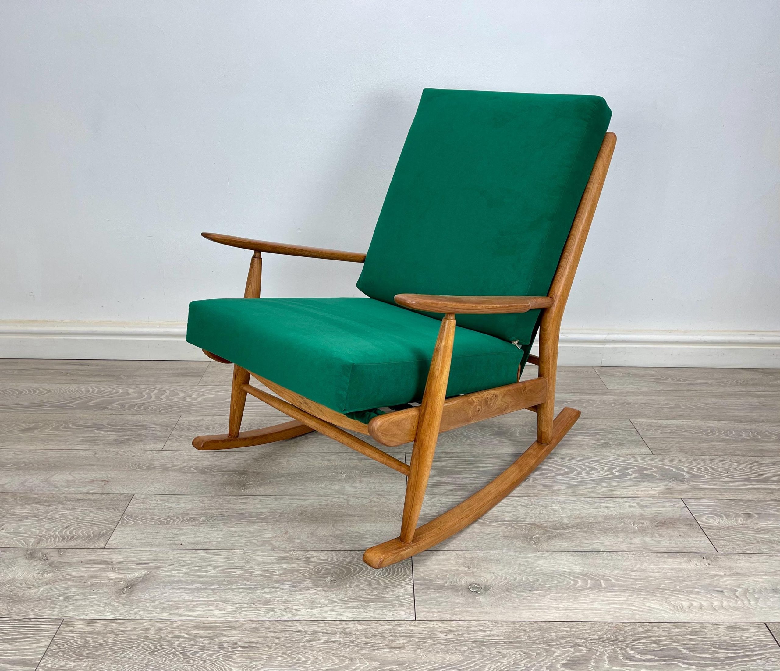 The rocking chair has been professionally restored, stripped and re-finished with new foam and fabric great condition . Please take time viewing photos as this is a good representation of condition.